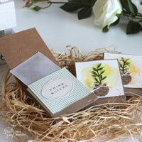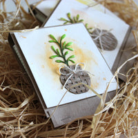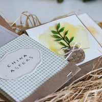 The three pockets are made from *Kraft Cardstock*, *Wild flowers 04*, *Vellum* and a *Sweet Label* to write down the type of plant you'll find on the inside. For the embellishment part I went for a small watercolor panel with a splash of color, the little vase from the *Bee sweet* die set and the branch part from *Rametti* die set.