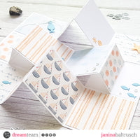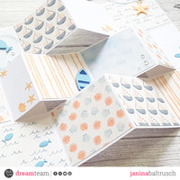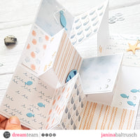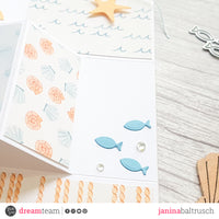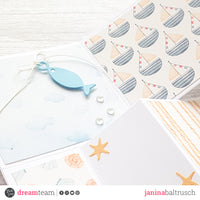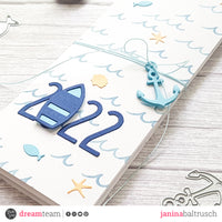 The numbers on the mini album are die cut with the ModaScrap GIANT ALPHABET Dies. I replaced the zero with the cute surfboard. To give the anchor more effect I punched it four times and glued it on top of each other.
