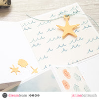 You can find the wonderful charms in the punch set ModaScrap SEA CHARMS die set. I decorated the paper cover with some starfish and fish.
