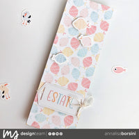 Per la copertina ho usato un altro foglio del paper pack, questa volta ho scelto quello con i pesciolini, creando una tag con la fustella ribbon tags e una scritta con la fustella tropical alphabet con i colori che trovate nella color palette.