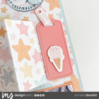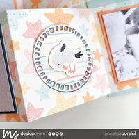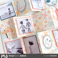 Ho creato la struttura con il foglio con le stelle marine del paper pack 12”x12”, creando dei quadrati di 3x3” che poi sono andata a decorare con fotografie, die cut che sono troppo simpatici, qualche fustellata creata con la fustella framed circles e i pesciolini che trovate nella fustella summer vibes!