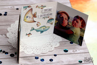 Come potete vedere l'album è composto da tre alette: due sono occupate dalle foto dei nipoti, quella centrale l'ho decorata tagliando un po' di pesciolini, trovati su una delle carte della collezione. I pesci più grandi li ho ritagliati dalla copertina del pack 12x12". Ogni pesciolino è accompagnato da una cucitura con normale filo bianco da cucito che traccia il suo percorso.