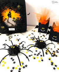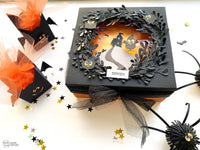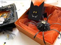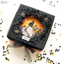 For the threats instead, I thought about a fake bat-shaped sweet for a perfect surprise effect. With the *Dream Flower* die a black cardboard and assembled the sunbursts, then polished some elements to create an additional 3D effect. I glued the sunbursts a small circle from Dashing Circles along with the paws made out of some black cardboards stripes.