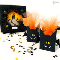 I made a small bat-shaped box with the *Really cute* die. I cut across the lines on the upper side to create the ears and antennae and with the left overs I created the wings. The box size is perfect for some Halloween sweets.