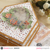 I chose the "Wonderlust" collection, which I find perfect for documenting fall, and made a mini-album in the shape of a house. On the cover there is a window covered with transparent acetate on which I stamped the stamp “mosaic”. I also did it on the spine.