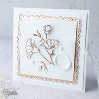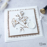 The basic card measures 15x15 cm and the second layer of white cardstock measures 14,1x14,1 cm. As third layer I again used the rose gold textile paper with the biggest of the new "Scallop squares" dies.