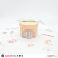 I've used a recycled cheese box (I really like the idea to reuse a packaging that should be thrown away) that I've covered with *New baby covering paper*. Then, I've decorated the box with the baby boy's name using *Giant Alphabet* e different branches from *Rametti* die set.