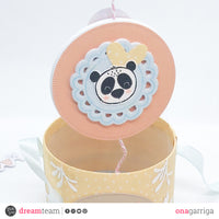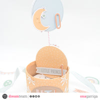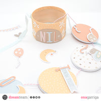 When you open the box you can find different circles from *Dashing circles* and the *New baby patterned paper* kept together with a string, each one of them will have a photo of Nil glued down. The embellishments are from the *new baby girl* and *new baby boy* die cuts. Both of the ends of the string are glued to the base of the box and to the base of the top lid, so when you open it you can see all the photos as a magic effect.