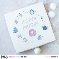 For this, I drew a very thin circle with a pencil and stuck on the cute puffy stickers. In the middle I added a birthday greeting with the white Puffy alphabet and a Puffy seal sticker.