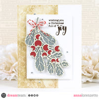 I used one of the dies from the Dashing Rectangles set to die-cut the main panel out of white card stock and stamped the sentiment (from the Chariot Of Joy stamp set) on its top-right corner, before foam mounting the gorgeous mistletoe branch on it.