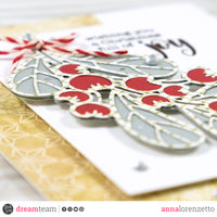 I started to work on this card by creating the mistletoe branch. First, I die-cut two solid shapes out of Pastel Acacia and Wild Flowers 04 card stock and then I used the outline die, included in the set, to die-cut a detailed branch shape out of the Wild Flowers 04 solid shape. I also die-cut the berries out of Pastel Strawberry card stock.